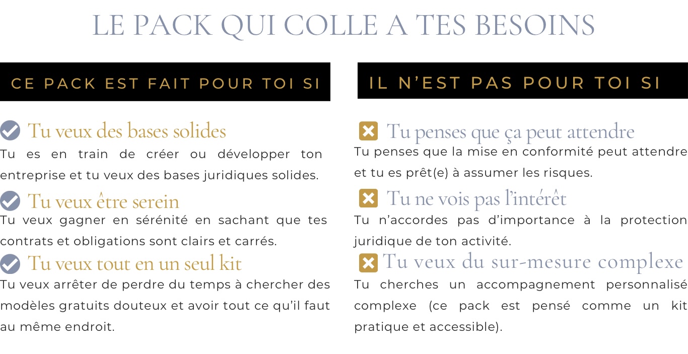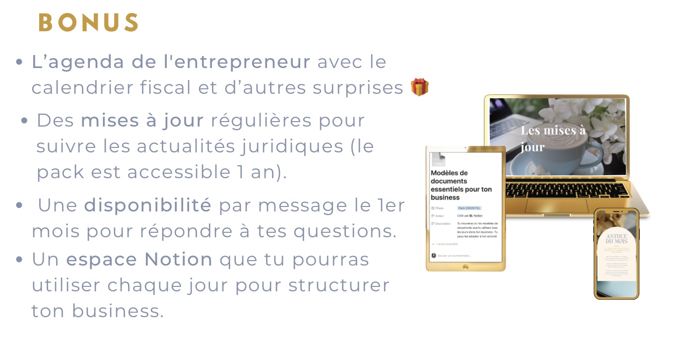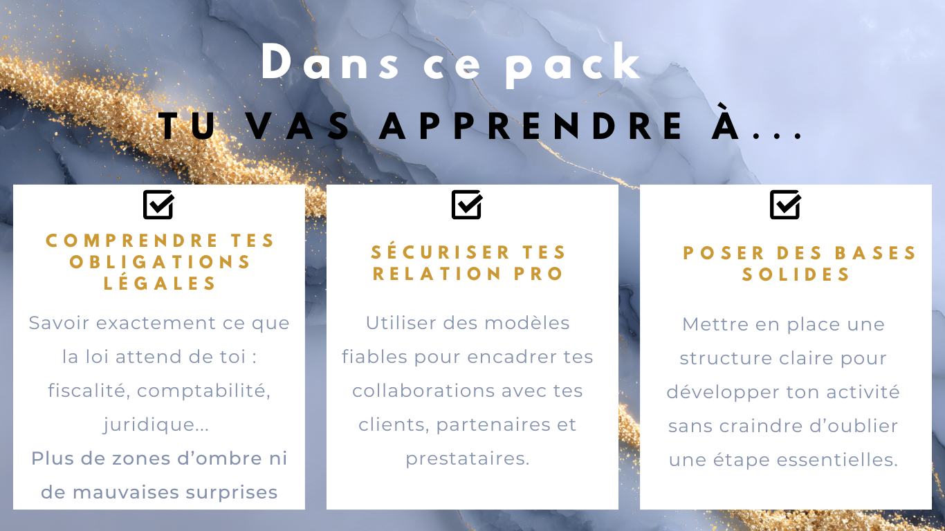 Le pack conçu par une avocate pour t’offrir une véritable boîte à outils juridiques et pratique pour entreprendre avec sérénité. Tu vas gagner en autonomie avec le sentiment d’avoir enfin le contrôle.