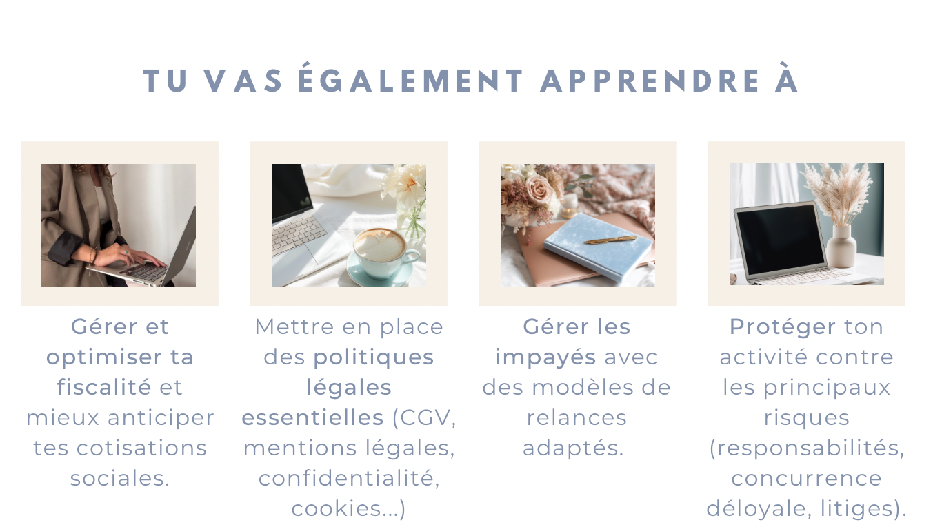 • Module 3 : Sécuriser ton parcours en protégeant ton business et tes créations (logo,marque,contenus).